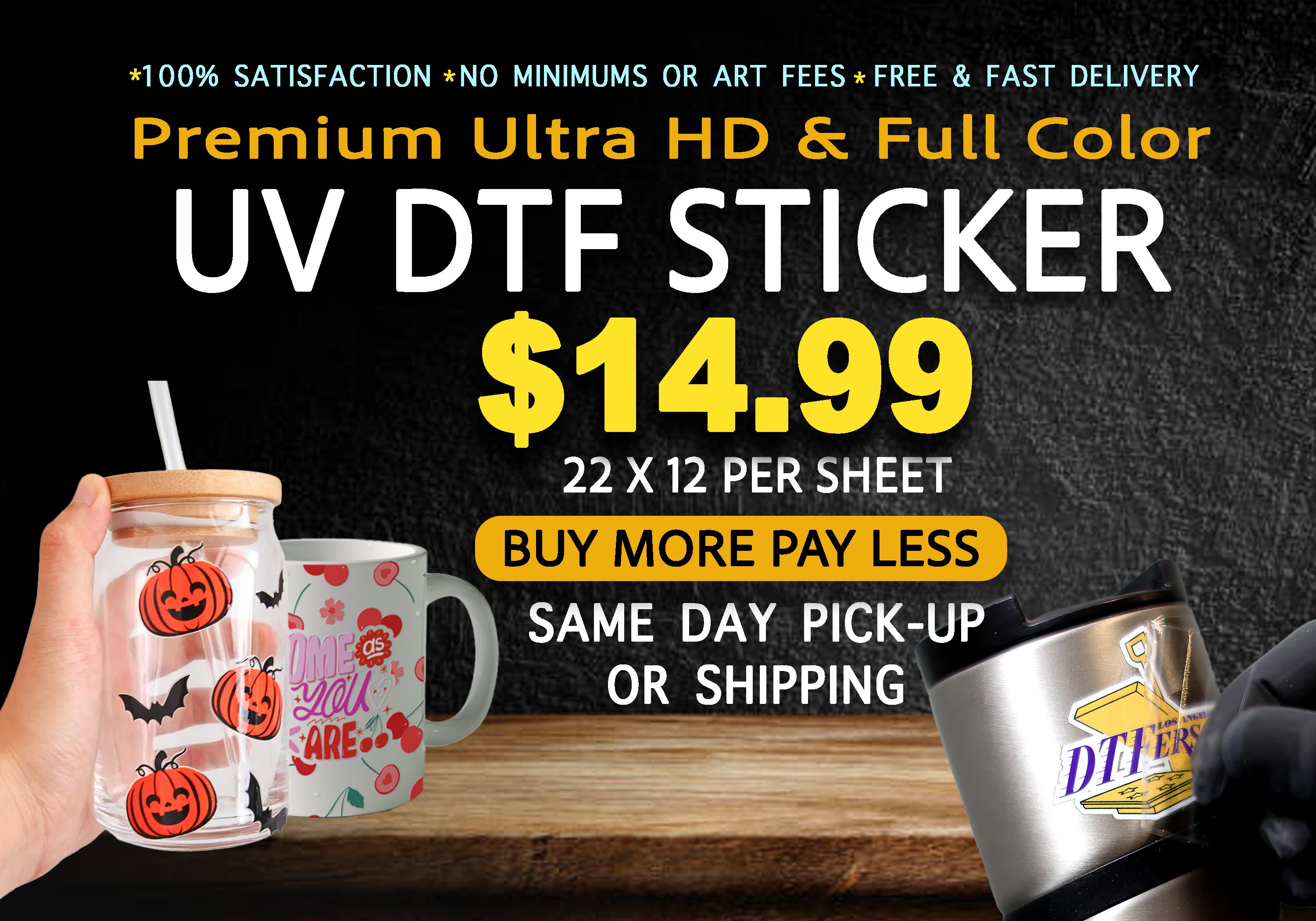 Create durable, full-color UV DTF stickers with stunning precision. Perfect for any surface – glass, metal, or acrylic – these gang sheets allow you to customize effortlessly. Use the online builder to upload your designs, choose specifications, and receive professional-grade stickers fast. At $14.99 per 22 x 12 sheet, you’ll enjoy unbeatable quality and affordability. Order today and experience same-day pick-up or quick shipping!